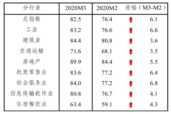 8个分行业指数全面上升。如下表所示,8个分行业指数均在景气临界值100以下。其中,社会服务业、工业、批发零售业、房地产业指数升幅较大,分别比上月上升6.8、6.6、6.4和5.5点。其他四个行业指数升幅也在3-4点之间。