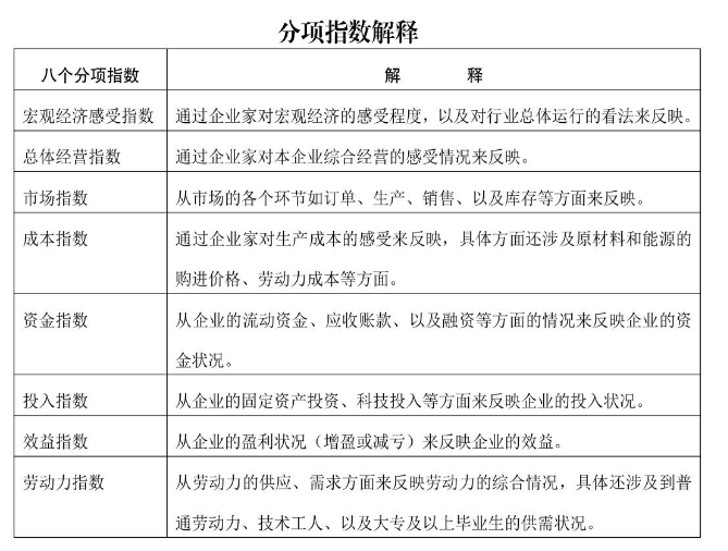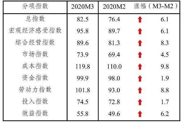 8个分项指数全面上升。除成本指数和劳动力指数恢复到景气临界值100以上外,宏观经济感受指数、综合经营指数、市场指数、资金指数、投入指数和效益指数均在100以下,其中效益指数仍处于最低位。