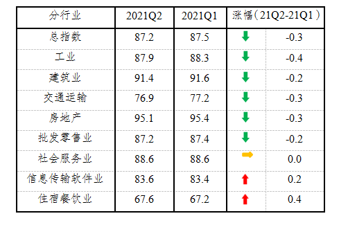 分行业指数2升1平5降。如下表所示,信息传输计算机软件业和住宿餐饮业指数分别上升0.2和0.4点,社会服务业指数持平,工业、建筑业、交通运输邮政仓储业、房地产业和批发零售业指数分别比上季度下降0.4、0.2、0.3、0.3和0.2点,8个分行业指数均处于景气临界值100以下。