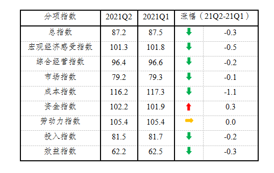分项指数1升1平6降。如下表所示,资金指数继续上升,劳动力指数止跌转平,宏观经济感受指数由升转降,成本指数继续下降,这4项指数一并保持在景气临界值100以上;综合经营指数、市场指数、投入指数和效益指数均比上季度有所下降,且仍处于景气临界值100以下,效益指数仍然处于最低位。