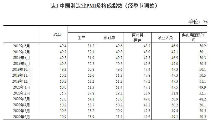 2020年6月,中国制造业采购经理指数(PMI)为50.9%,比上月上升0.3个百分点。