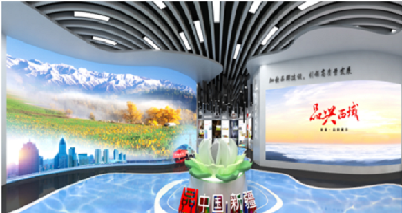 “品兴西域”云上展馆设计以雪山和雪莲为创意来源,以绚丽的艾德莱斯绸为基调,吸纳新疆河流、冰川等元素,结合活动主题及新疆地域人文特色,打造了一个现代时尚、开放互动的云上展馆,体现了新疆各族人民共饮天山水,团结一心共建美丽新疆的美好愿景,西域风情十分浓郁。馆内布局划分为新疆品牌建设展区、农业品牌体验区、工业品牌体验区及旅游兴疆体验区等4个版块,遴选18家新疆品牌企业参展,全面展示新疆优势产业品牌发展成果,助力“品牌强区”“质量强区”和“旅游兴疆”战略实施,引领新疆经济高质量发展。