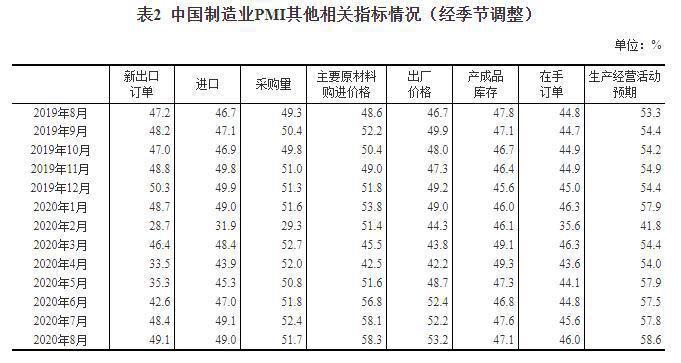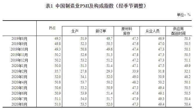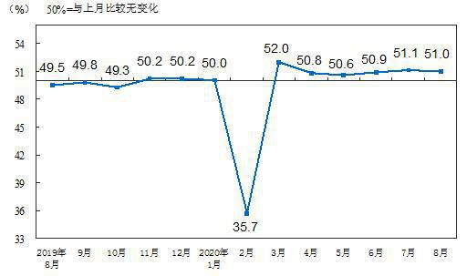 8月份,中国制造业采购经理指数(PMI)为51.0%,比上月略降0.1个百分点,表明制造业总体平稳运行。
