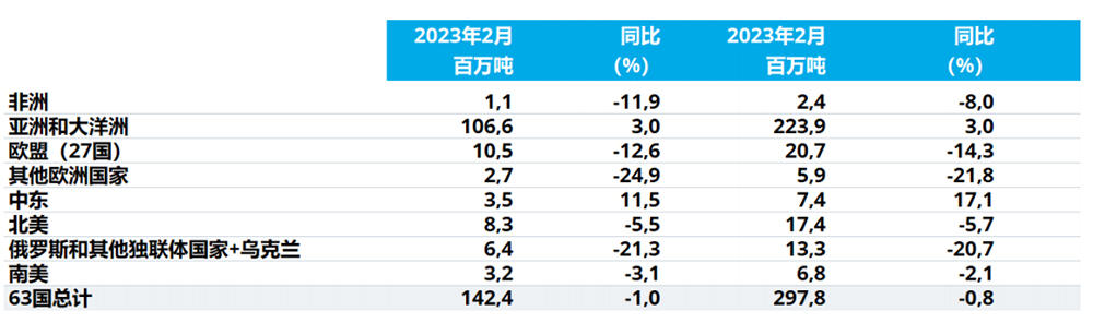2023年2月,非洲粗钢产量为110万吨,同比下降11.9%;亚洲和大洋洲粗钢产量为1.066亿吨,同比提高3.0%;欧盟(27国)粗钢产量为1050万吨,同比下降12.6%;其他欧洲国家粗钢产量为270万吨,同比下降24.9%;中东粗钢产量为350万吨,同比提高11.5%;北美粗钢产量为830万吨,同比下降5.5%;俄罗斯和其他独联体国家+乌克兰粗钢产量为640万吨,同比下降21.3%;南美粗钢产量为320万吨,同比下降3.1%。
