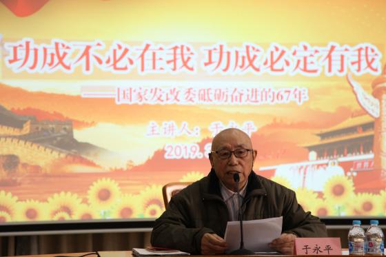 为庆祝新中国成立70周年,继承光荣传统,发扬优良作风,离退休干部局组织开展“老干部讲传统”活动。正局级离休干部于永平同志以“功成不必在我 功成必定有我——国家发展改革委砥砺奋进的67年”为题,为党员干部讲党课,讲述发展改革故事和国家发展改革委光荣传统及优良作风,局党委书记、局长胡继申同志主持活动。