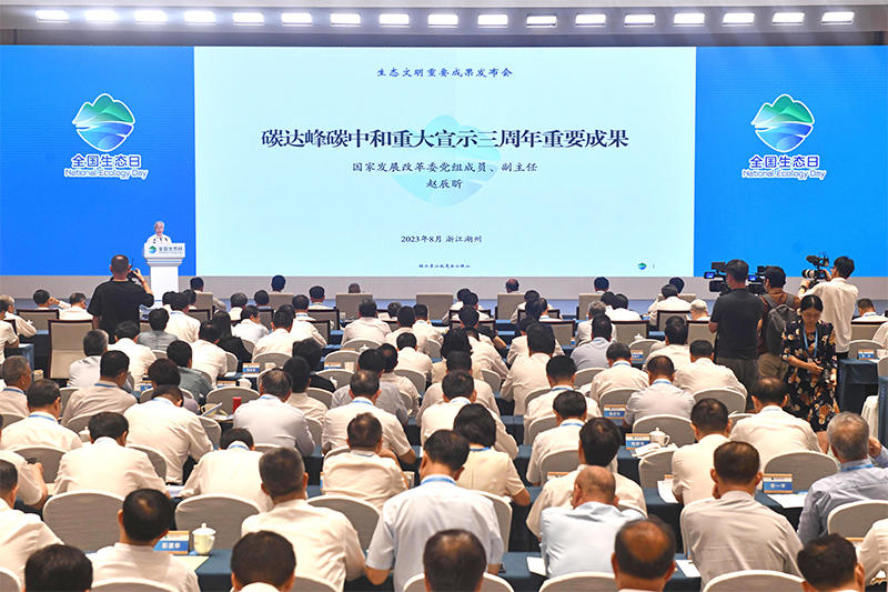 15日上午的生态文明重要成果发布会上,国家发展改革委副主任赵辰昕发布碳达峰碳中和重大宣示三周年重要成果,工业和信息化部总工程师赵志国发布工业绿色低碳发展成效,自然资源部总规划师吴海洋发布《中国生态保护红线蓝皮书(2023年)》,生态环境部自然生态保护司司长王志斌发布2015—2020年全国生态状况调查评估成果,国家能源局副局长何洋发布能源绿色低碳转型成效,国家林草局副局长谭光明发布林草生态文明建设成果,中国科学院院士代表朱彤发布百名院士全国生态日倡议,浙江省人民政府常务副省长徐文光发布全国生态日湖州倡议。国家发展改革委副秘书长袁达主持发布会。