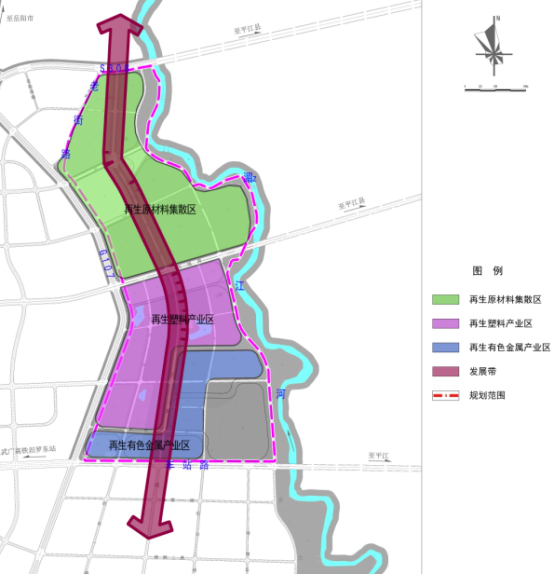基地按照“一轴、三片区”优化布局,由北向南分别是再生原材料集散区、再生塑料产业区和再生有色金属产业区3大片区,贯穿南北规划建设了一条创新大道工业发展轴(图1),其服务范围主要包括岳阳市、“长株潭+武汉”城市群,同时可接收湖南省周边城市危险废弃物。随着正威集团百亿级项目和国内“500强”金发科技、攀华集团项目先后落户,基地已形成了有色金属新材料(再生铜、铝、不锈钢等)精深加工、高分子材料等产业布局,主导产业四梁八柱的特色产业布局逐步构建。