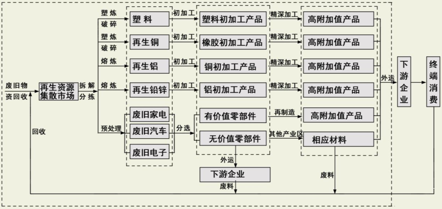 二是突出优势产业链,构建绿色低碳资源循环利用产业全链条。通过系统研究基地的工业基础条件和区域产业分工与协作关系,最终确定发展以再生塑料产业和再生有色金属产业为基地的主导产业链。经过培育和发展,该产业链已经形成铜材、铝制品、不锈钢、塑料回收加工四大板块主导产业,产品也由单一再生原材料产品回收向中间和终端产品纵深发展。同时,产业通过回收废物—再生原材料—中间产品—深加工终端产品等环节延伸,既增加了附加经济效益,也减轻了在收集、运输、储存、加工过程中的污染。
