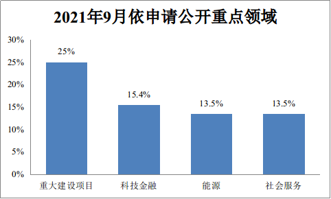 2021年9月,国家发展改革委收到公民、法人和其他组织政府信息公开申请共52件,正常办结35件(含上月结转),均严格按照《政府信息公开条例》等有关规定进行办理和答复。从申请方式看,网络申请占比40.4%,信函申请占比59.6%。申请事项主要集中在重大建设项目、科技金融、能源领域以及社会服务等方面(各类占比详见下图)。