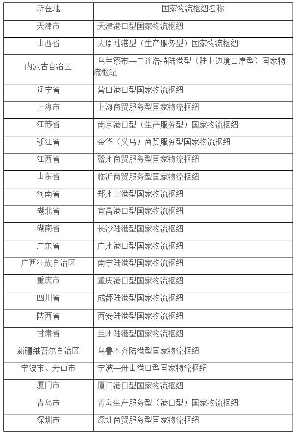 近日,国家发展改革委、交通运输部联合印发《关于做好2019年国家物流枢纽建设工作的通知》(发改经贸﹝2019﹞1475号),共有23个物流枢纽入选2019年国家物流枢纽建设名单(附后),其中东部地区10个(天津、上海、南京、金华(义乌)、临沂、广州、宁波—舟山、厦门、青岛、深圳)、中部地区5个(太原、赣州、郑州、宜昌、长沙)、西部地区7个(乌兰察布—二连浩特、南宁、重庆、成都、西安、兰州、乌鲁木齐)、东北地区1个(营口),涵盖陆港型、空港型、港口型、生产服务型、商贸服务型、陆上边境口岸型等6种类型,区域、类型分布相对均衡,有利于支撑“一带一路”建设、京津冀协同发展、长江经济带发展、粤港澳大湾区建设、长三角区域一体化发展、西部陆海新通道等重大战略实施和促进形成强大国内市场。