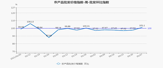 2021年第18周(5月1日—5月7日),北京市农产品批发价格指数环比为101.1,上涨1.1%;同比为111.41,上涨11.41%。