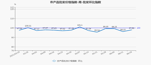 2021年第24周(6月12日—6月18日),北京市农产品批发价格指数环比为97.91,下降2.09%;同比为110.33,上涨10.33%。