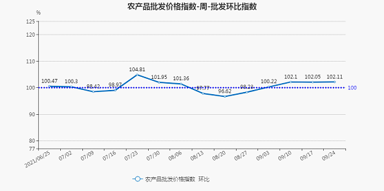 2021年第38周(9月18日—9月24日),北京市农产品批发价格指数环比为102.11,上涨2.11%;同比为97.41,下降2.59%。