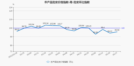 2022年第21周(5月21日—5月27日),北京市农产品批发价格指数环比为95.59,下降4.41%;同比为112.77,上涨12.77%。