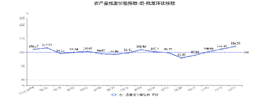 2023年第45周(11月11日—11月17日),北京市农产品批发价格指数环比为104.33,上涨4.33%;同比为98.69,下降1.31%。