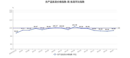 本周农产品批发价格指数持续稳中有降。其中,近期生猪出栏价格持续回升、端午节日效应拉动消费需求及备货需求增加,猪肉批发价格持续稳中有涨,猪粮比价为6.86:1;随着蔬菜产地向北转换衔接顺畅、蔬菜供应充足,蔬菜批发价格持续季节性下降;目前鸡蛋市场供应充裕、需求回落,鸡蛋批发价格由涨转降。