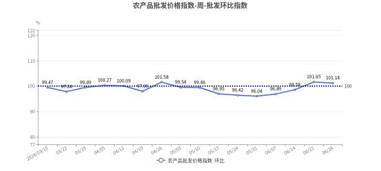 本周农产品批发价格指数环比持续稳中有涨。其中,近期供京蔬菜产地继续北移以及北方高温天气持续,黄瓜、叶菜类等部分蔬菜生产供应受到影响,加之保鲜成本增加,蔬菜批发价格持续季节性上涨;目前鸡蛋市场供应充足、需求稳定,鸡蛋批发价格以稳为主;由于生猪出栏价格回落、白条猪上市量增加,猪肉批发价格稳中有降,猪粮比价为7.2:1。