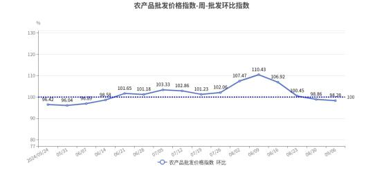 2024年第35周(8月31日—9月6日),北京市农产品批发价格指数环比为98.28,下降1.72%;同比为129.04,上涨29.04%。
