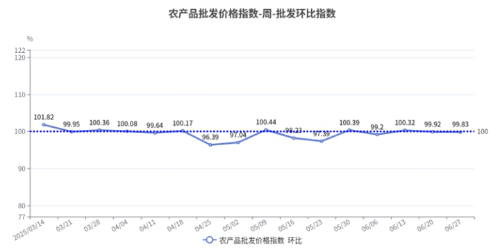 2025年第25周(6月21日—6月27日),北京市农产品批发价格指数环比为99.83,下降0.17%;同比为105.51,上涨5.51%。
