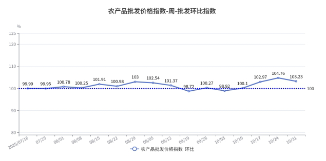 2025年第43周(10月25日—10月31日),北京市农产品批发价格指数环比为103.23,上涨3.23%;同比为108.57,上涨8.57%。