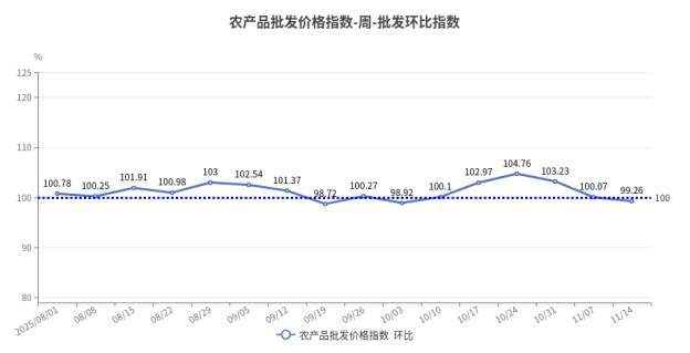 2025年第45周(11月8日—11月14日),北京市农产品批发价格指数环比为99.26,下降0.74%;同比为116.74,上涨16.74%。