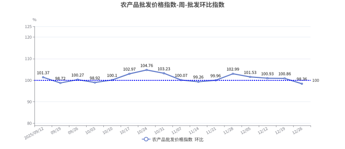 2025年第51周(12月20日—12月26日),北京市农产品批发价格指数环比为98.36,下降1.64%;同比为114.05,上涨14.05%。