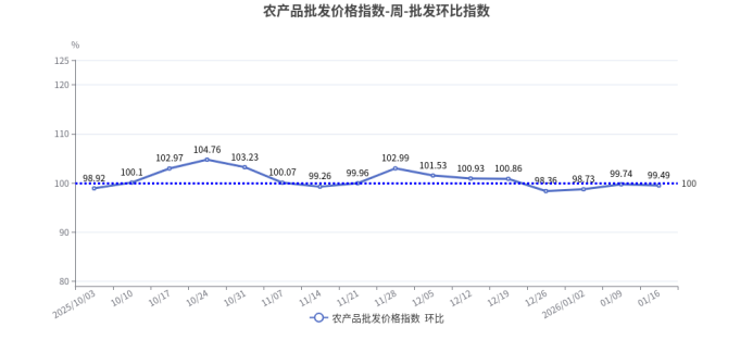 2026年第2周(1月10日—1月16日),北京市农产品批发价格指数环比为99.49,下降0.51%;同比为108.45,上涨8.45%。