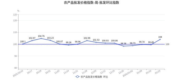 2026年第3周(1月17日—1月23日),北京市农产品批发价格指数环比为104,上涨4%;同比为109.91,上涨9.91%。