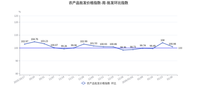 2026年第4周(1月24日—1月30日),北京市农产品批发价格指数环比为100.98,上涨0.98%;同比为102.33,上涨2.33%。