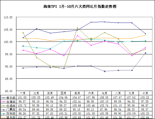 1-10月,住宿类环比月指数波动较大,2月呈现快速上升后3月大幅度下降,5月逐步恢复平稳后有明显下降,10月再增长的走势;交通类环比月指数呈波浪型走势;门票类环比月指数呈稳中略降,降后反升的走势;餐饮类、购物类、娱乐类环比月指数整体保持基本稳定。