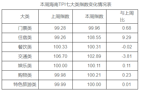 海南TPI七大类(门票、住宿、餐饮、交通、娱乐、购物、特色旅游)指数呈“四涨三平”的态势。住宿类、交通类、餐饮类、购物类价格指数分别涨至108.55、102.89、100.31、100.11,周环比分别上涨8.55%、2.89%、0.31%、0.11%,影响海南TPI周指数分别上涨2.09、0.78、0.02、0.04个百分点;门票类、娱乐类、特色旅游类价格指数与上周基本持平。