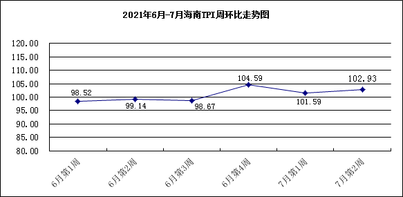 根据海南省发展改革委监测数据显示,7月第2周(2021年7月5日-7月11日),中国·海南旅游消费价格指数(简称“海南TPI”)为102.93,周环比上涨2.93%。
