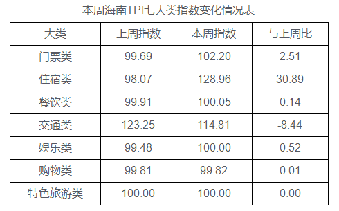 海南TPI七大类(门票、住宿、餐饮、交通、娱乐、购物、特色旅游)指数呈“三涨一降三平”的态势。住宿类、交通类、门票类价格指数分别涨至128.96、114.81、102.20,周环比分别上涨28.96%、14.81%、2.20%,影响海南TPI周指数分别上涨7.07、4.00、0.15个百分点;购物类价格指数降至99.82,周环比下降0.18%,影响海南TPI周指数下降0.04个百分点;餐饮类、娱乐类、特色旅游类价格指数与上周基本持平。