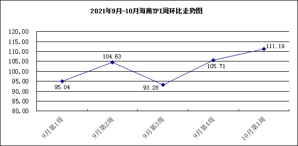 根据海南省发展改革委监测数据显示,10月第1周(2021年9月27日-10月3日),中国·海南旅游消费价格指数(简称“海南TPI”)为111.19,周环比上涨11.19%。