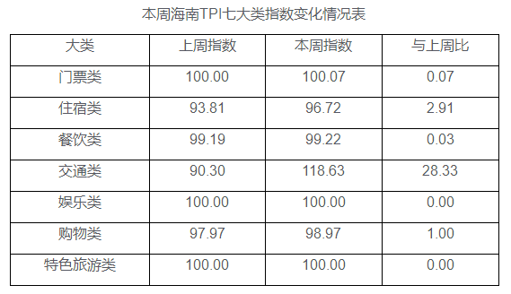 海南TPI七大类(门票、住宿、餐饮、交通、娱乐、购物、特色旅游)指数呈“一涨三降三平”的态势。交通类价格指数涨至118.63,周环比上涨18.63%,影响海南TPI周指数上涨5.03个百分点;住宿类、购物类、餐饮类价格指数分别降至96.72、98.97、99.22,周环比分别下降3.28%、1.03%、0.78%,影响海南TPI周指数分别下降0.80、0.20、0.05个百分点;门票类、娱乐类、特色旅游类价格指数与上周基本持平。