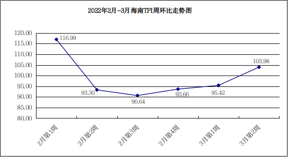 根据海南省发展改革委监测数据显示,3月第2周(2022年3月7日-3月13日),中国·海南旅游消费价格指数(简称“海南TPI”)为103.98,周环比上涨3.98%。