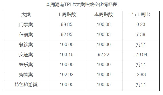 海南TPI七大类(门票、住宿、餐饮、交通、娱乐、购物、特色旅游)指数呈“一降二涨四平”的态势。交通类价格指数降至92.22,周环比下降7.78%,影响海南TPI周指数下降2.10个百分点;住宿类、购物类价格指数分别涨至100.33、100.09,周环比分别上涨0.33%、0.09%,影响海南TPI周指数分别上涨0.08、0.02个百分点;门票类、餐饮类、娱乐类、特色旅游类价格指数与上周基本持平。