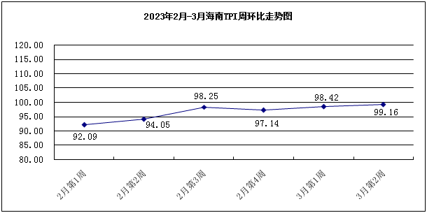 根据海南省发展改革委监测数据显示,3月第2周(2023年3月6日-12日),中国·海南旅游消费价格指数(简称“海南TPI”)为99.16,周环比下降0.84%。
