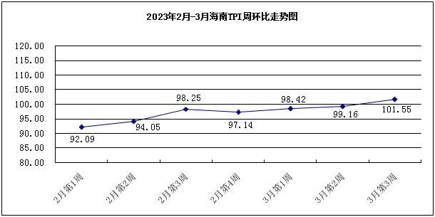 根据海南省发展改革委监测数据显示,3月第3周(2023年3月13日-19日),中国·海南旅游消费价格指数(简称“海南TPI”)为101.55,周环比上涨1.55%。