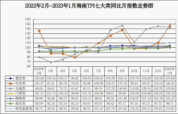 海南TPI同环比上涨的主要影响因素:一是新型冠状病毒防控措施优化,疫情影响减弱。随着新型冠状病毒防控措施优化,各类出行限制取消,新增感染人数下降,大众旅游出行意愿得到恢复。二是春节黄金周拉动旅游市场消费。省内舒适的冬季气候优势吸引大量游客赴琼度假,据统计,今年春节黄金周我省接待游客总人数639.36万人次,同比增长18.2%。春节假期效应强劲释放,旅游消费市场供销两旺,进一步拉动旅游消费价格同环比上涨。