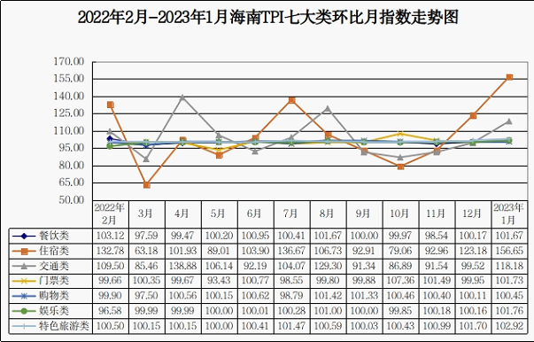 2.2023年1月海南TPI环比运行情况。2023年1月,海南TPI七大类指数环比均呈上涨态势。住宿类、交通类、特色旅游类、娱乐类、门票类、餐饮类、购物类价格指数环比分别上涨56.65%、18.18%、2.92%、1.76%、1.73%、1.67%、0.45%,分别影响海南TPI上涨13.84、4.91、0.32、0.08、0.12、0.11、0.09个百分点。从监测小类看,2023年1月海南TPI中酒店客房、轿车租赁价格环比涨幅居前,分别上涨42.87%、32.83%。