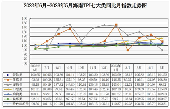 2023年6月,预计海南TPI将呈同环比上涨的走势。海南TPI同环比受旅游消费市场持续复苏,高温天气有所缓解,毕业季、端午假期到来等利好因素影响将呈现上涨趋势。其中我省酒店客房、汽车租赁价格等旅游消费价格同比将延续上涨趋势,环比受旅游市场需求拉动或将止跌上涨;国内航班机票价格同环比将呈上涨趋势;餐饮类、购物类、娱乐项目收费价格或呈同环比小幅上涨的走势;特色旅游类中高尔夫收费、温泉收费等旅游消费价格继续呈环比持平的走势。