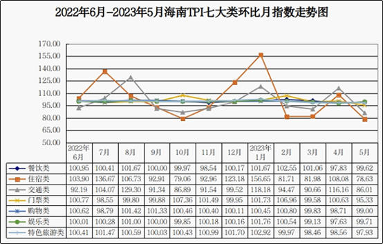 2.2023年5月海南TPI环比运行情况。2023年5月,海南TPI七大类指数环比均呈下降态势。住宿类、交通类、门票类、特色旅游类、购物类、餐饮类、娱乐类价格指数环比分别下降21.37%、13.99%、4.67%、2.07%、1.00%、0.38%、0.29%,分别影响海南TPI下降5.22、3.78、0.32、0.23、0.20、0.02、0.01个百分点。从监测小类看,2023年5月海南TPI中酒店客房、国内航班机票价格环比降幅居前,分别下降16.61%、15.26%。