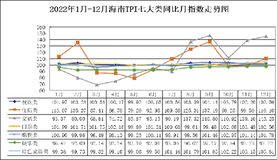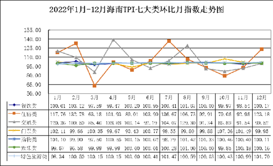 2.2022年12月海南TPI环比运行情况。2022年12月,海南TPI七大类指数环比呈“五涨一降一平”的态势。住宿类、特色旅游类、餐饮类、娱乐类、购物类价格指数环比分别上涨23.18%、1.70%、0.17%、0.16%、0.11%,分别影响海南TPI上涨5.66、0.19、0.01、0.01、0.02个百分点;交通类环比下降0.48%,影响海南TPI下降0.13个百分点;门票类价格指数环比基本持平。从监测小类看,2022年12月海南TPI中酒店客房价格环比涨幅居前,上涨18.38%。
