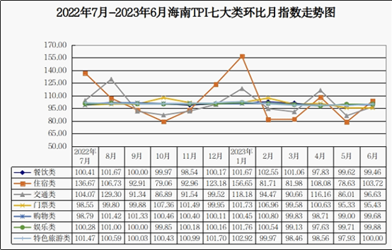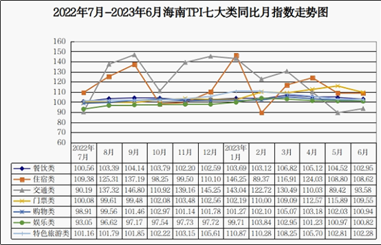 2023年7月,预计海南TPI将呈同环比略涨的走势。受大型演艺举办,暑期效应释放等利好因素影响,海南TPI同环比将呈上涨趋势。其中我省酒店客房、国内航班机票价格受旅游消费热度上升影响,同环比将呈上涨趋势;餐饮类、购物类、娱乐项目等旅游消费价格或呈同比略涨,环比小幅下降的走势;交通类中高铁乘坐、出租车乘坐,特色旅游类中高尔夫收费、温泉收费、会议室租赁等旅游消费价格将继续保持平稳走势。