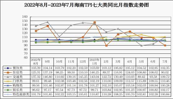 1.2023年7月海南TPI同比运行情况。2023年7月,海南TPI七大类指数同比呈六涨一降的态势。门票类、交通类、餐饮类、娱乐类、特色旅游类、购物类价格指数同比分别上涨10.46%、9.72%、2.35%、2.17%、0.84%、0.28%,分别影响海南TPI上涨0.71、2.62、0.15、0.10、0.09、0.06个百分点;住宿类价格指数同比下降9.98%,影响海南TPI下降2.44个百分点。从监测小类看,2023年7月海南TPI中国内航班机票价格同比涨幅居前,上涨9.56%。