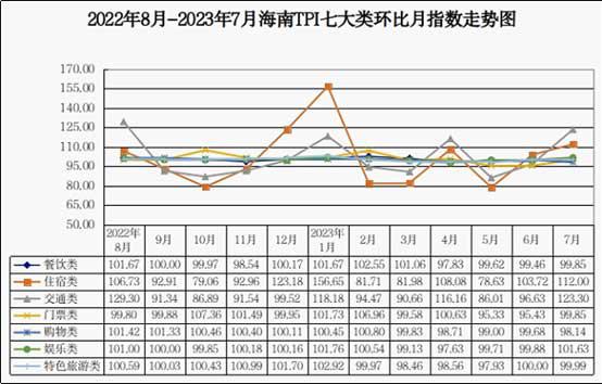 2.2023年7月海南TPI环比运行情况。2023年7月,海南TPI七大类指数环比呈“三涨三降一平”态势。交通类、住宿类、娱乐类价格指数环比分别上涨23.30%、12.00%、1.63%,分别影响海南TPI环比上涨6.29、2.93、0.07个百分点;购物类、门票类、餐饮类价格指数环比分别下降1.86%、0.15%、0.15%,分别影响海南TPI环比下降0.37、0.01、0.01个百分点;特色旅游类价格指数环比基本持平。从监测小类看,2023年7月海南TPI中国内航班机票价格环比涨幅较大,上涨28.91%。