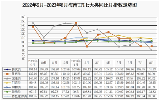 2023年9月,预计海南TPI将呈同环比下降的走势。受暑期结束,台风、多雨季节到来,旅游市场消费热度相对减弱,海南TPI同环比将呈下降趋势。其中我省国内航班机票、酒店客房、会议室租赁等旅游消费价格同环比将呈下降趋势;餐饮类、娱乐类旅游消费价格或呈同比上涨,环比小幅下降的走势;购物类、特色旅游类中温泉收费等旅游消费价格环比或略有上涨;交通类中高铁乘坐、出租车乘坐,旅游门票类等旅游消费价格将基本平稳。