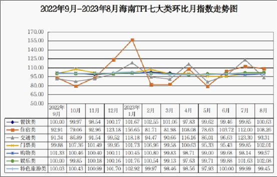 2.2023年8月海南TPI环比运行情况。2023年8月,海南TPI七大类指数环比呈“四涨三降”态势。住宿类、娱乐类、门票类、餐饮类价格指数环比分别上涨8.26%、2.08%、2.01%、0.63%,分别影响海南TPI环比上涨2.02、0.10、0.14、0.04个百分点;交通类、特色旅游类、购物类价格指数环比分别下降6.69%、0.55%、0.43%,分别影响海南TPI环比下降1.81、0.06、0.09个百分点。从监测小类看,2023年8月海南TPI中酒店客房价格环比涨幅居前,上涨4.88%。