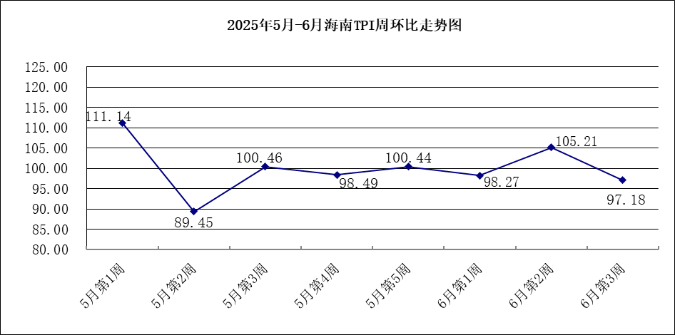 据海南省发展改革委监测数据显示,6月第3周(2025年6月16日-22日),中国·海南旅游消费价格指数(简称“海南TPI”)周环比下降2.82%。